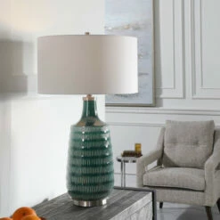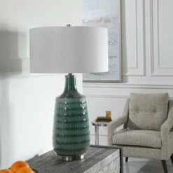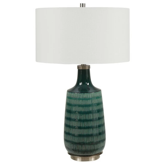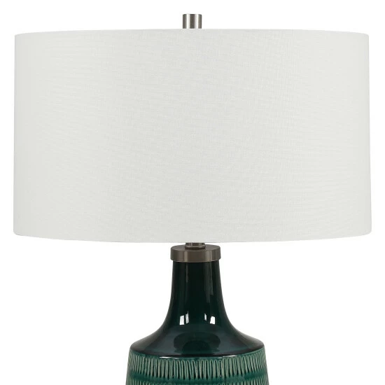 Finished in a stunning deep teal glaze, this ceramic table lamp features hand carved organic vertical lines accented with brushed nickel details. The lamp is paired with a white fabric drum shade.