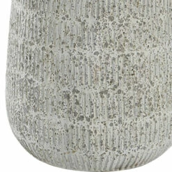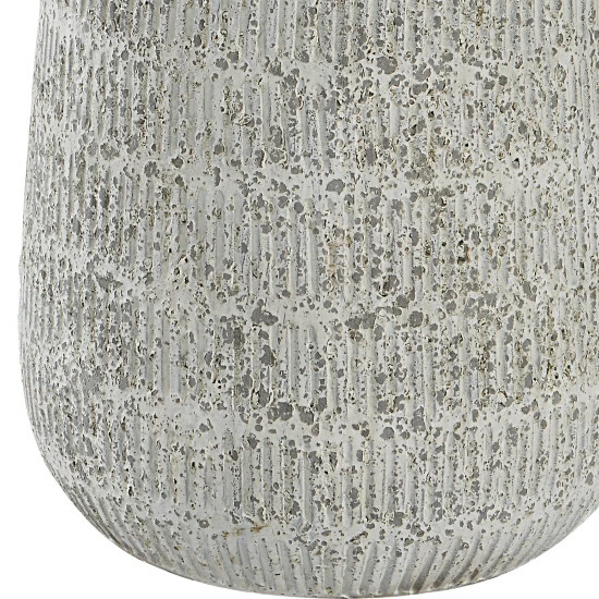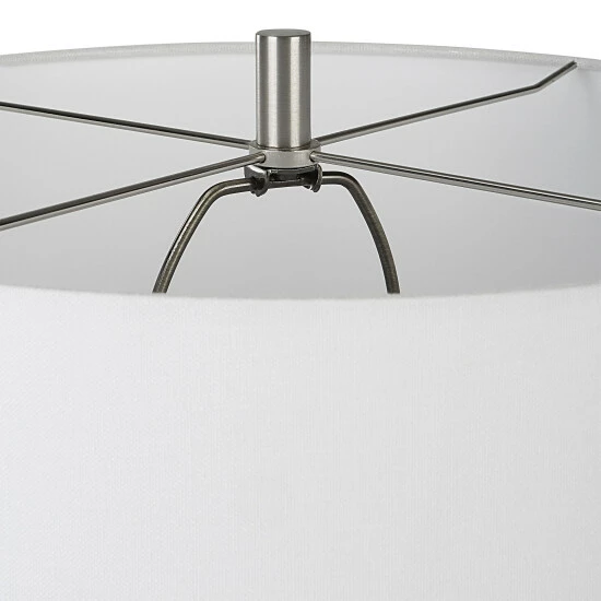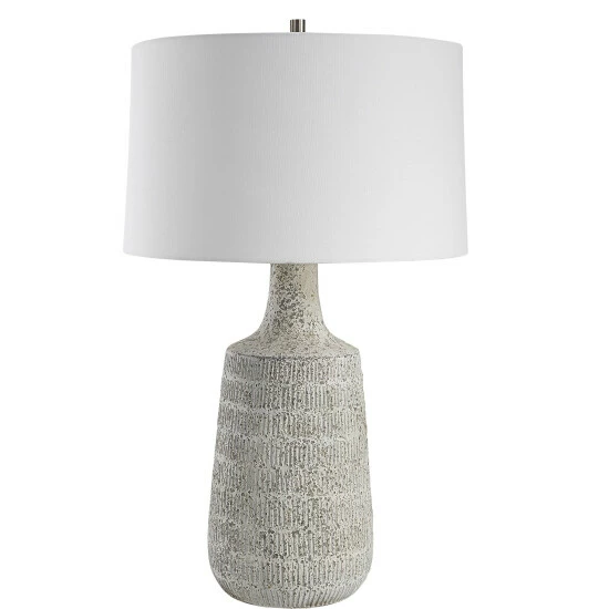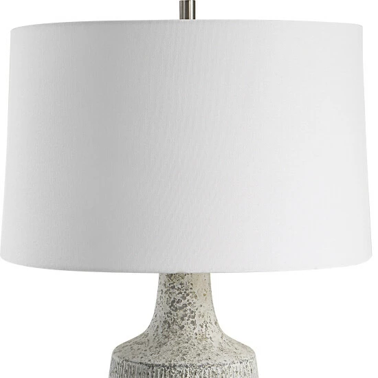 Drawing inspiration from antique clay pottery, this table lamp is handcrafted from ceramic in a mottled gray and off-white matte glaze with subtle carved details. Steel accents are finished in brushed nickel. The hardback drum shade is covered in a casual white fabric.