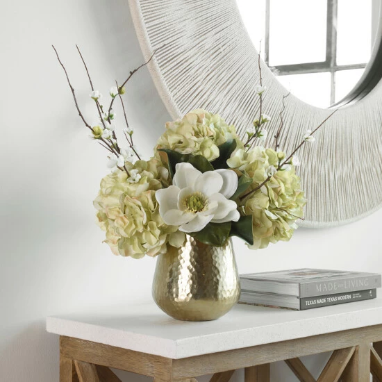 A fresh spring bouquet of magnolias, green hydrangea blooms, and white cherry blossom branches are arranged in a stylish gold finished hammered metal vase.