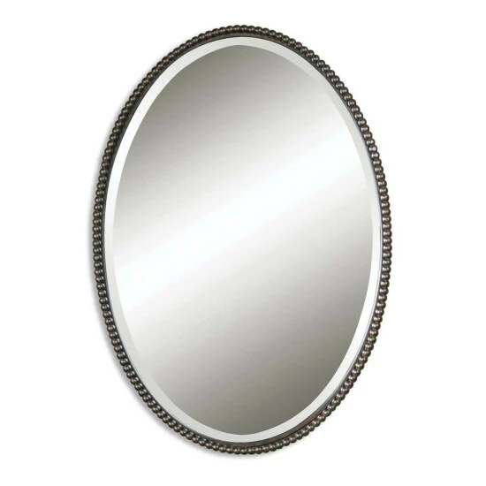 This traditional style bronze wall mirror by Uttermost is edged in a beaded design that catches the light. The beveled edge of the glass creates additional framing around this oval wall mirror. The lightly distressed oil-rubbed bronze finish gives it a convincing vintage look. Hang the mirror near an entryway for a last glance before leaving the house or welcoming guests.