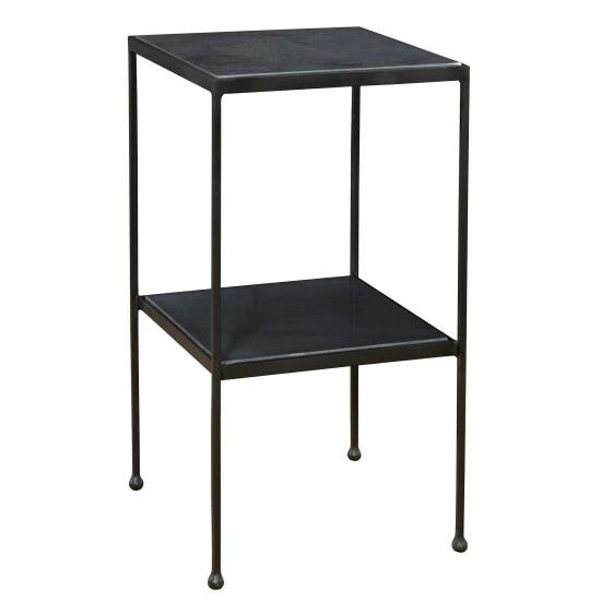 Constructed from solid iron, this accent table is finished in a smooth matte black with double black honed marble shelves.