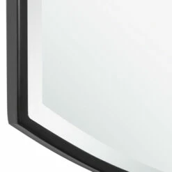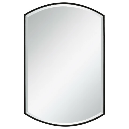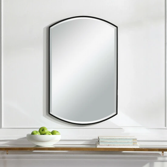 Simple yet versatile, this mirror features a curved iron frame with a sleek satin black finish and a generous 1 1/4 inches bevel.