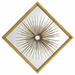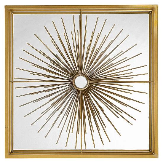 Petite iron frame finished in antique brushed brass displays a mirrored interior, accented by a striking 3-dimensional iron starburst motif.