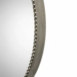 This petite iron frame features a beaded surface with a deep profile, hand finished in a lightly antiqued silver leaf. Mirror has a generous 1.25-inch bevel.