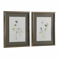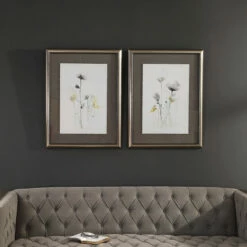 Prints feature deckled edges and are floating above the soft, dark grey mats. Prints are under glass with a narrow, silver frame with black inner lip completing the artwork. Colors included in the prints are soft grey, forest green and golden yellow on off-white backgrounds.
