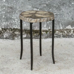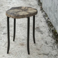 This rustic modern accent table features a suar wood cross-cut section with natural live edge details and a rich petrified finish, on tapered metal legs finished in aged iron.