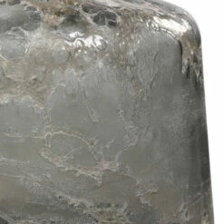 Crafted from art glass, these bottles showcase a unique, heavy texture and are finished in neutral shades of charcoal, taupe, and silver. Each is accented by a silver leaf finished iron top.