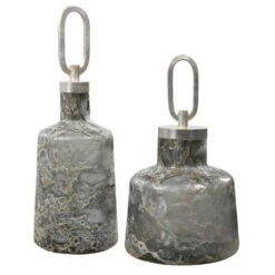 Crafted from art glass, these bottles showcase a unique, heavy texture and are finished in neutral shades of charcoal, taupe, and silver. Each is accented by a silver leaf finished iron top.