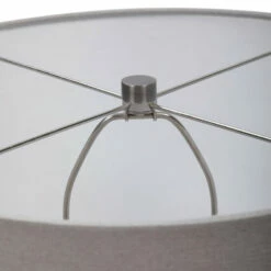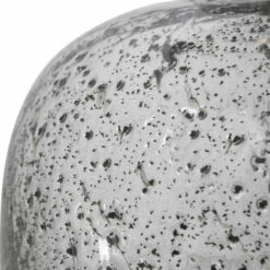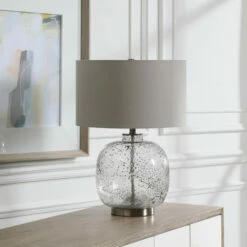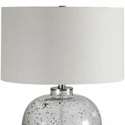 Modern style table lamp features a translucent art glass base with abstract black flecks throughout, accented with brushed nickel details. The round hardback drum shade is a light grey linen fabric with natural slubbing.