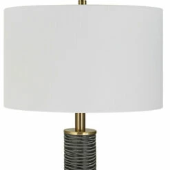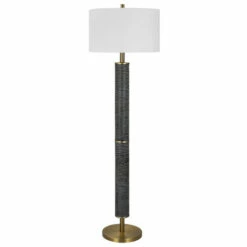 This floor lamp features an organically carved design in a rustic gray-black with solid iron details finished in plated antique brass. The lamp is paired with a hardback drum shade in a white linen fabric.