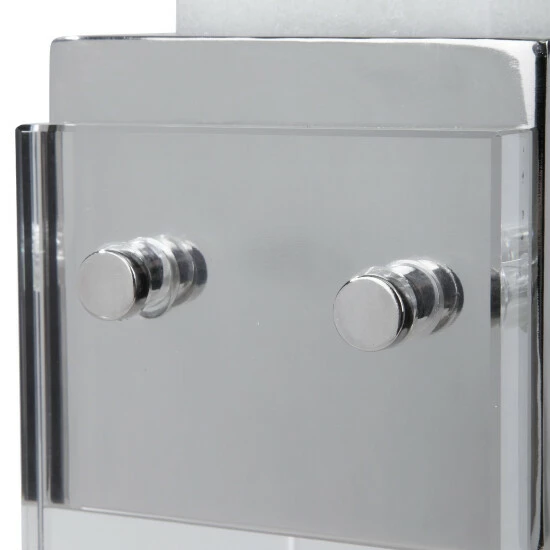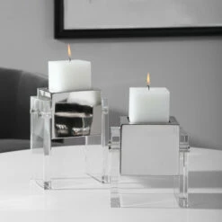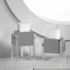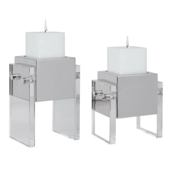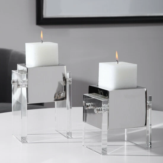 Set of two crystal and polished nickel candle holders. Two 3 x 3 inches distressed white square candles are included.