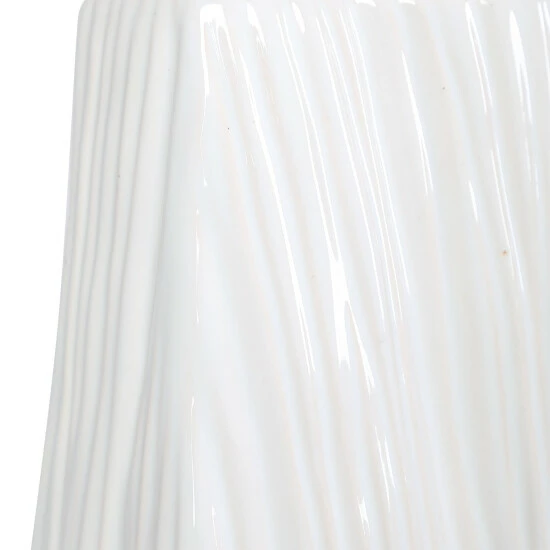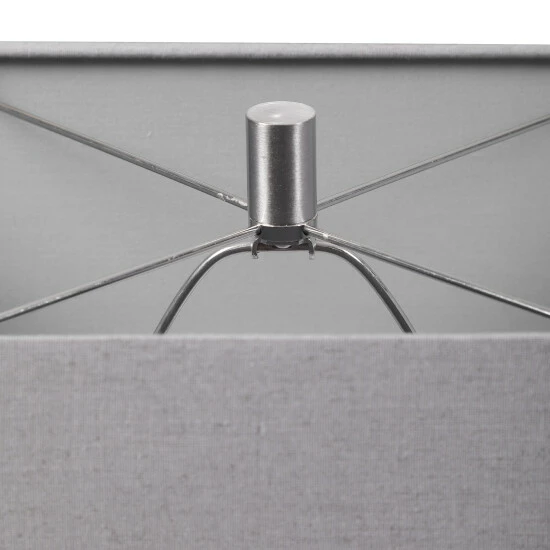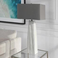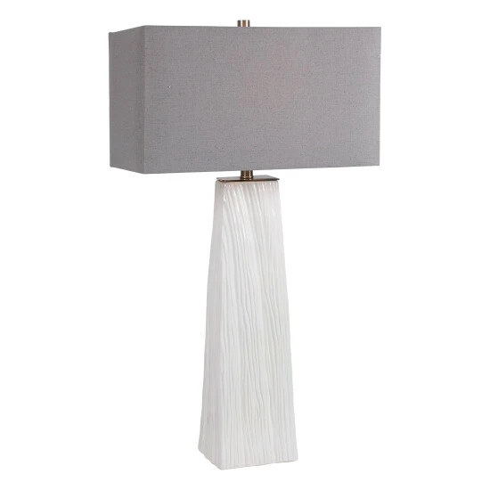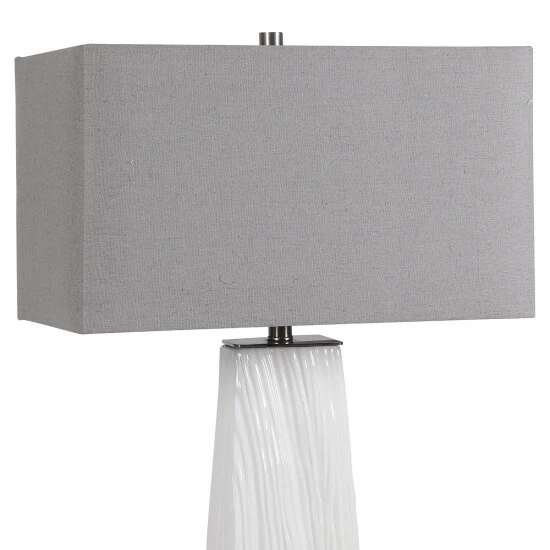 Elegant and versatile, this table lamp features a gloss white ceramic base featuring organic hand carved details and brushed nickel accents. The piece is paired with a rectangle hardback shade in grey linen fabric with natural slubbing.