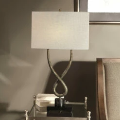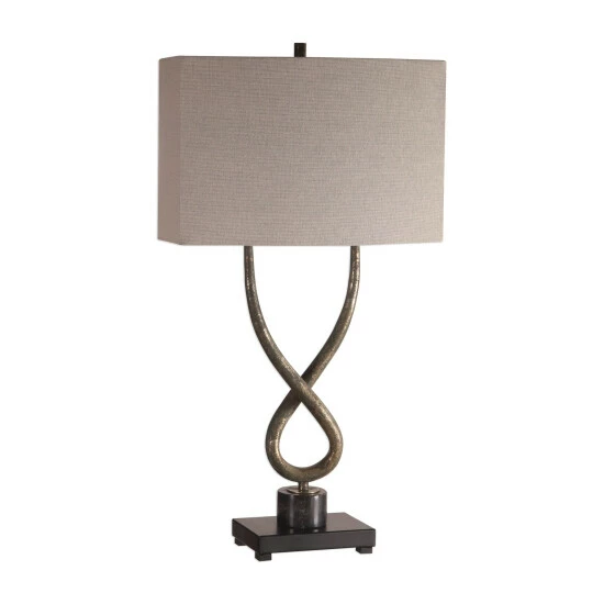 This twisted steel base is gracefully curved with a subtly tapering design, finished in a heavily distressed aged silver leaf with charcoal undertones, displayed on a black marble column. the oval hardback shade is a light beige linen fabric with straight sides.