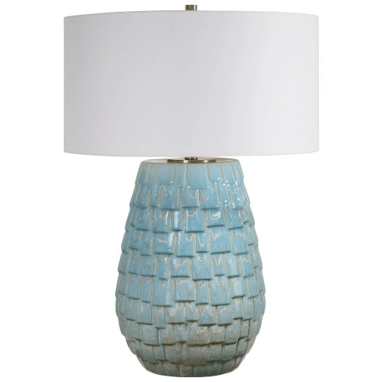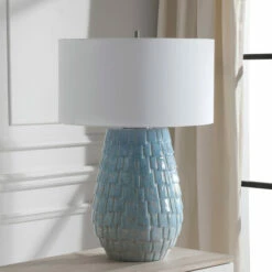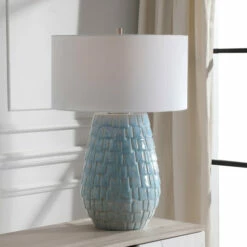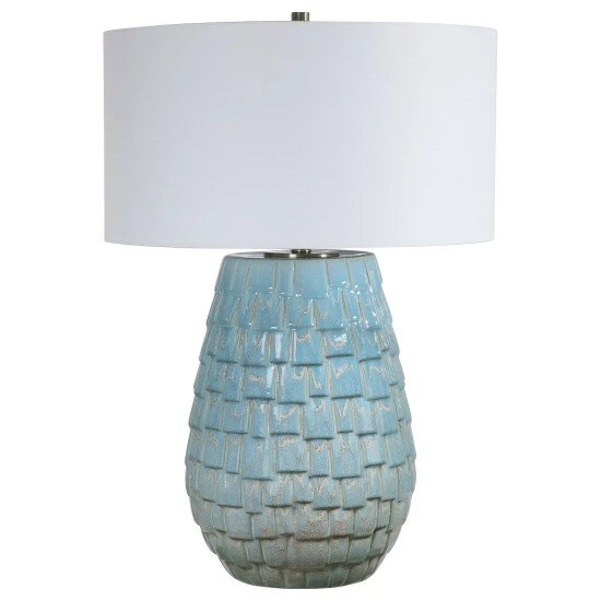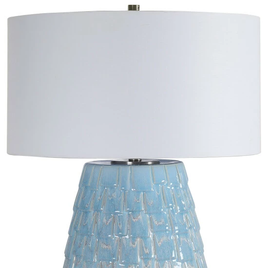 Showcasing a unique overlap design, this ceramic table lamp is finished in a pastel blue glaze with rust ivory undertones accented with brushed nickel details. The lamp is paired with a white fabric drum shade.