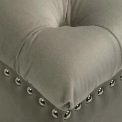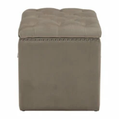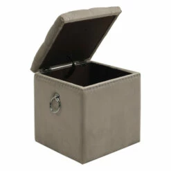 Covered in a luxurious champagne velvet, this plush button tufted lid opens up for concealed storage with an interior safety hinge. Complete with polished nickel ring pulls and nail head trim.