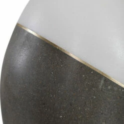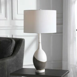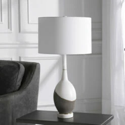 Simple yet sophisticated, this table lamp features a combination of honed charcoal concrete and a polished white marble look, accented by brushed gold plated accents. The lamp is complimented by a crisp white hardback drum shade.