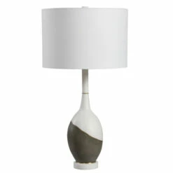 Simple yet sophisticated, this table lamp features a combination of honed charcoal concrete and a polished white marble look, accented by brushed gold plated accents. The lamp is complimented by a crisp white hardback drum shade.