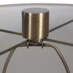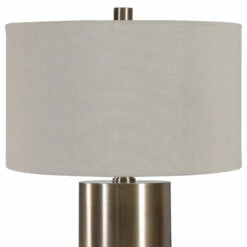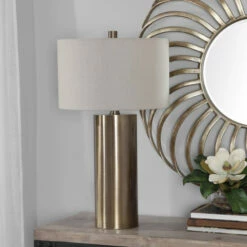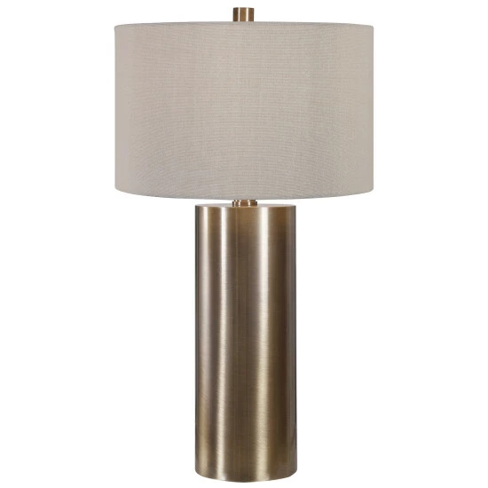 Finished in an antiqued brushed brass, this table lamp keeps it simple yet upscale with a large metal cylinder base with matching accents. The hardback drum shade is finished in a beige linen fabric.