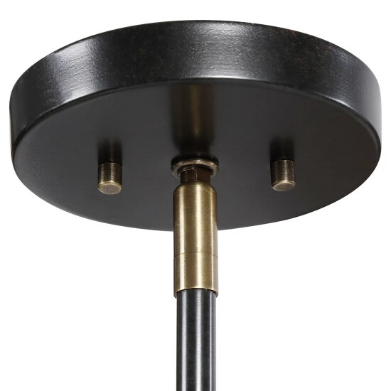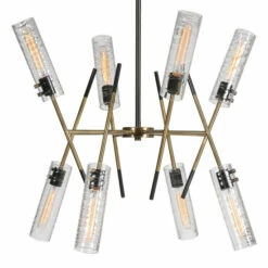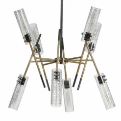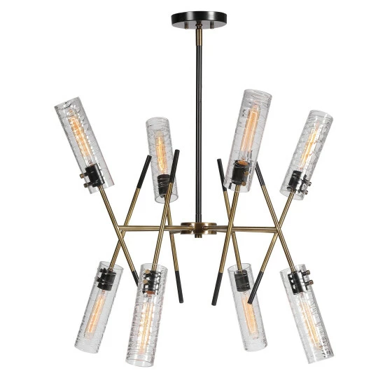 A dramatic soft contemporary look blends straight lines and linear glass to give us this eye catching 8-light pendant. Featuring a combination finish of texture black and antique brass complimenting the narrow clear cylinders of glass with unique swirled thread accents. 8-60 watt max, edison sockets. supplied with 15 feet wire, 3-12 inches stems, and 1-6 inches stems for adjustable installation.