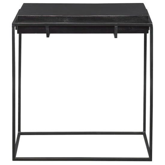 With modern minimalist styling, this side table features a thick cast aluminum top with natural texturing finished in a dark oxidized black, resting in a coordinating aged black iron base.