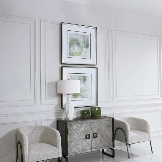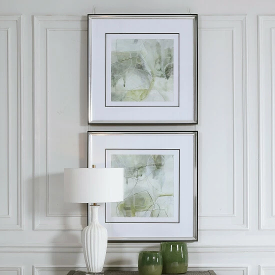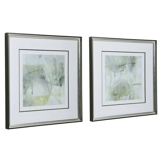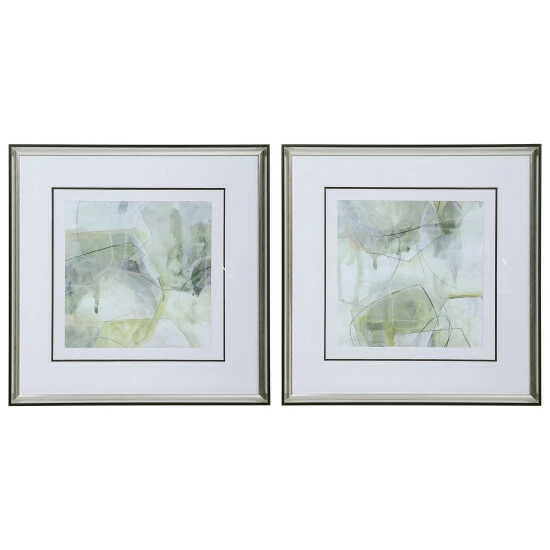 Sporting cool shades of emerald, sage, and olive green, these contemporary framed prints add the perfect amount of color and sophistication. Each print is accented by triple black and white matting under glass with a sleek polished silver frame.