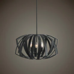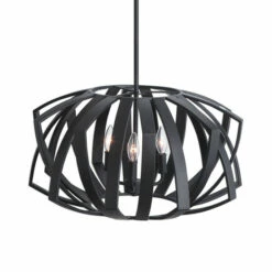 Matte black geometric pendant harkens from mid century design roots. 3-60 watt max, candelabra sockets and 3-12 inches stems and 1-6 inches stem for adjustable installation.