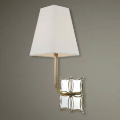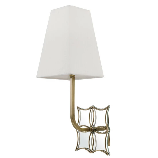Sumptuous details of antique brass overlay a shaped mirror back plate and give this 1-light sconce a fresh femininity while featuring a crisp off white linen hardback shade adding classic elegance. 1-60 watt max. Candelabra socket.