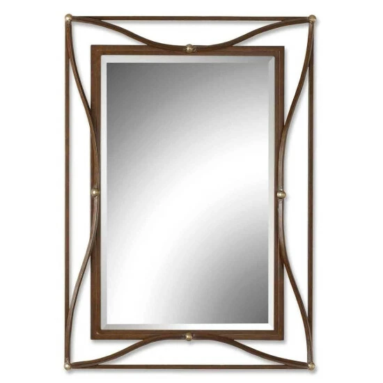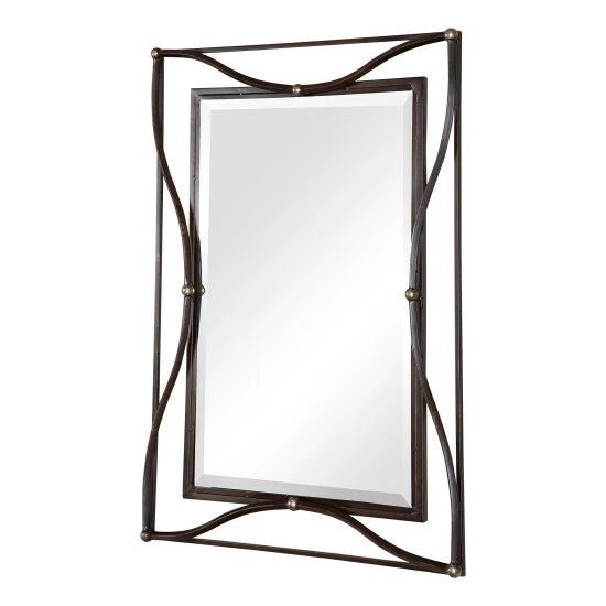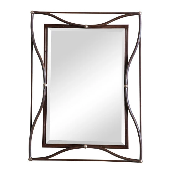 This beveled mirror features dual frames finished with scratched bronze and accented with champagne silver leaf. Arched center bars connect the two open center frames of this bronze mirror, lending a transitional and pastoral vibe to this stylish piece. This rectangular mirror adds just the right touch of eclectic style to any room in your home.