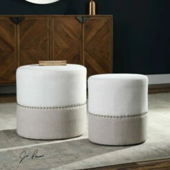 Pull out for extra seating, or tuck away for a space saving solution, these ottomans feature a two toned linen blend fabric in oatmeal and creamy white hues, accented with polished nickel nail head trim.