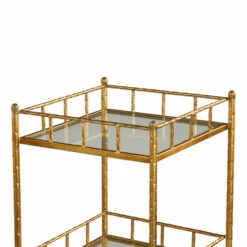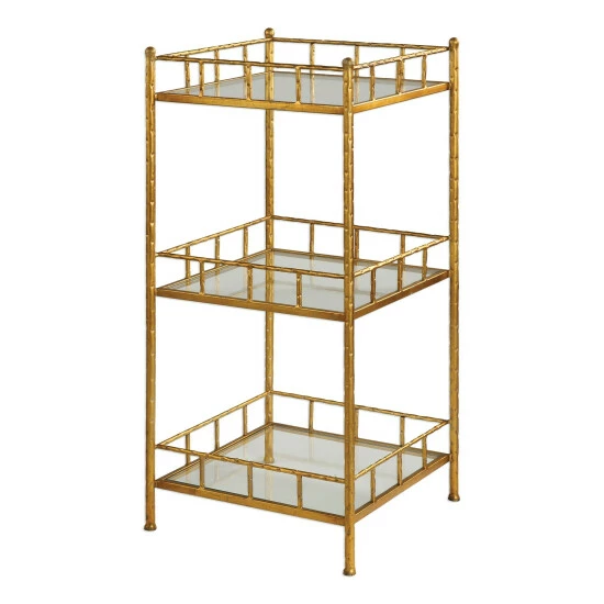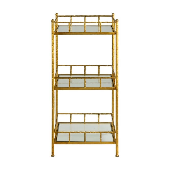 Add a touch of glam with this accent piece featuring caged tray style shelves with hammered texturing finished in bright gold leaf. Shelves are clear glass.