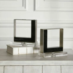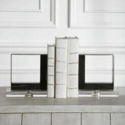 Modern and sophisticated these bookends feature black marble accents with white veining, accented by brushed nickel finished steel and crystal accents.