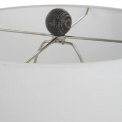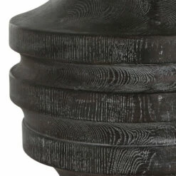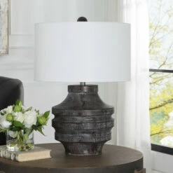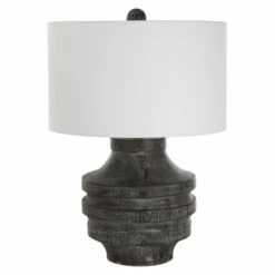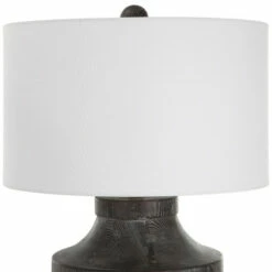 The perfect rustic accent, the timber table lamp brings the outdoors in with a carved wood look in a transparent black stain with warm undertones and a light white glaze accentuating the faux wood grain. The hardback drum shade is covered in a white cotton fabric.