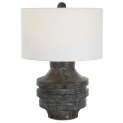 The perfect rustic accent, the timber table lamp brings the outdoors in with a carved wood look in a transparent black stain with warm undertones and a light white glaze accentuating the faux wood grain. The hardback drum shade is covered in a white cotton fabric.
