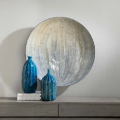 This solid iron wall disc is hand painted in ombre brushstrokes of grey and light yellow tones sealed with a glossy coating.