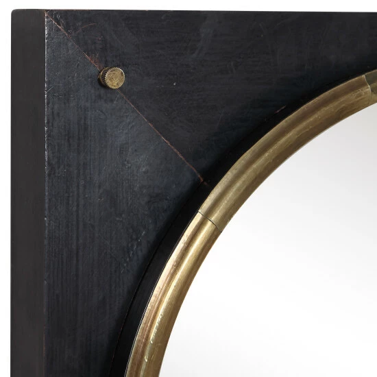 This contemporary mirror is constructed using a solid wood frame with copper cladding, finished in a lightly oxidized dark bronze and antiqued copper sheet accents. The mirror has a 1 inch bevel.