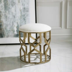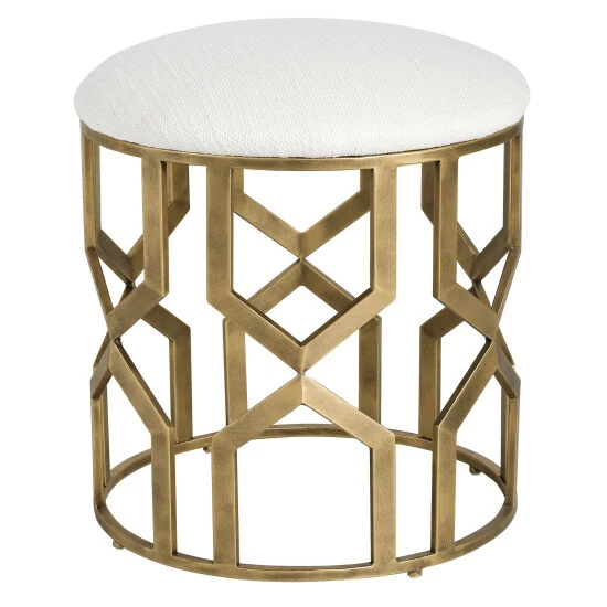 Stylish and versatile, this round accent stool showcases a solid iron base with a modern geometric motif finished in antique brushed brass. The cushioned top is upholstered in a crisp white textured fabric, doubling its use as a seat or footrest.