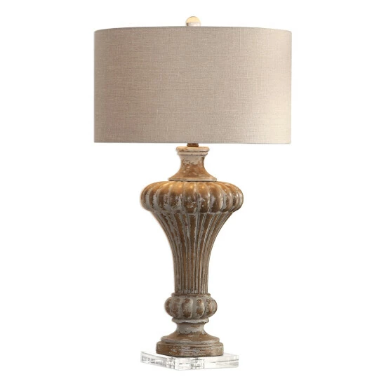 This updated look on an ornate traditional style features a hand painted aged pecan finish with a heavily distressed antique grey wash, accented with thick crystal details. The round hardback drum shade is a light beige linen fabric with natural slubbing.