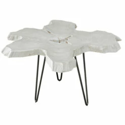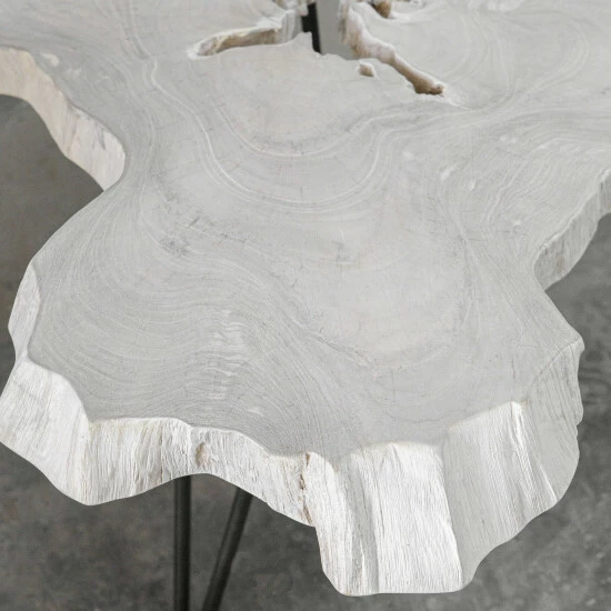 This striking coffee table is topped with a cross section of natural teak wood in a bleached finish supported by black metal hairpin legs. Sizes and grain pattern may vary due to the authentic nature of the design.