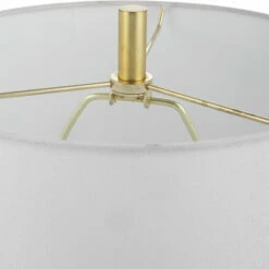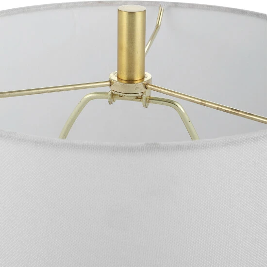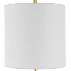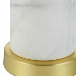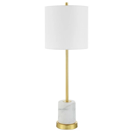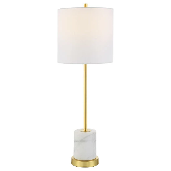 Stylish and versatile, this buffet lamp features a slim metal body in an elegant brushed gold finish paired with a substantial white marble foot. The round hardback shade is covered in a white linen fabric.