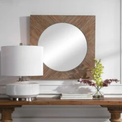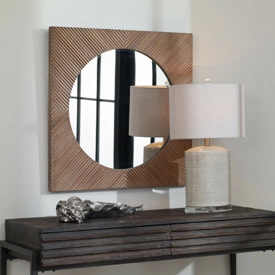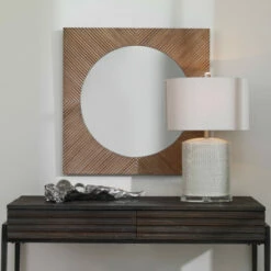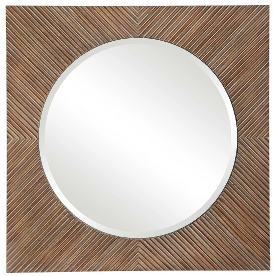 Add visual interest to a space with this mirror that features a square frame covered in solid fir wood reeded channels in a subtle chevron pattern. A light natural stain with a taupe wash highlights the texture of the piece. Group multiples together to create a striking wall feature.