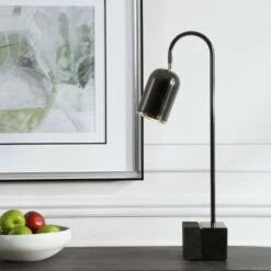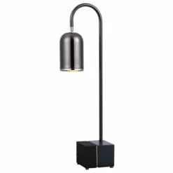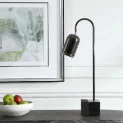 Contemporary style desk lamp showcases a sleek steel base finished in a plated black nickel with a matching metal shade and polished nickel accents. The block foot is a combination of black lava stone and black marble with subtle white veining and beveled edges.
