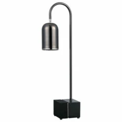 Contemporary style desk lamp showcases a sleek steel base finished in a plated black nickel with a matching metal shade and polished nickel accents. The block foot is a combination of black lava stone and black marble with subtle white veining and beveled edges.
