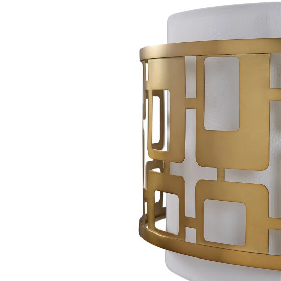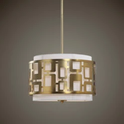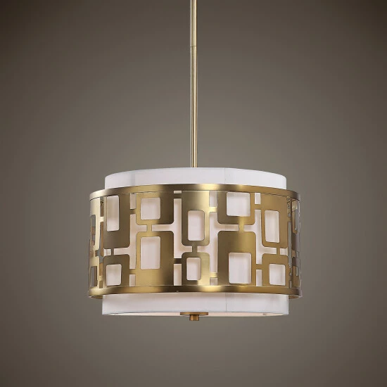 This 3 Lt. Mid-century feel pendant features a floating cut-out retro square pattern in a natural brass finished outer shade, complimented with a white linen fabric inner shade and bottom frosted glass diffuser. 3-60 watt max, Edison sockets. Includes 15 feet wire, with 3-12 inches stems and 1-6 inches stem for adjustable installation.