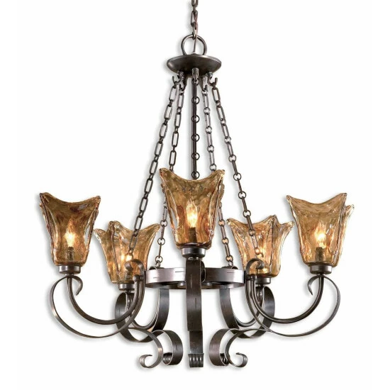 Bring elegance and style to your home with this Uttermost Vetraio chandelier. This five-light metal fixture features an oil-rubbed bronze finish and colored glass shades for a sophisticated appeal. Curved ironwork offers an Old World charm, making this light a wonderful choice for a formal dining room or grand foyer.