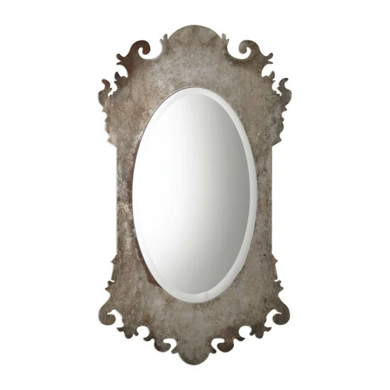 A modern take on a classic Chippendale inspired design, this elegant piece is crafted from thick, laser cut iron finished in a burnished oxidized silver with an aged grey wash. Mirror has a generous 1.25-inch bevel.