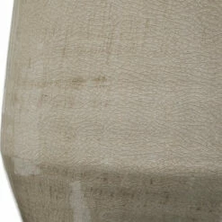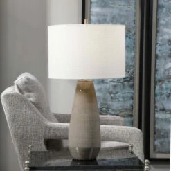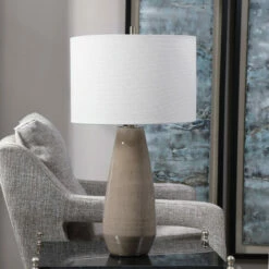 Simple yet stylish, this ceramic table lamp is finished in a crackled taupe-grey glaze with noticeable distressed details and antique brushed brass accents. The round hardback drum shade is a white linen fabric.