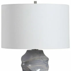 A contemporary take on classic blue and white ceramics, this table lamp features a unique sculpted design with a hand applied light cobalt blue drip glaze. The lamp is paired with a crisp white hardback drum shade.