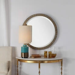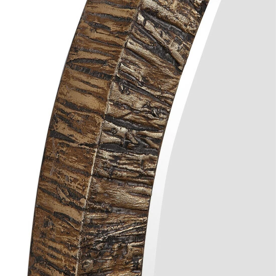 This classic round mirror showcases a modern style that is easy to place in any design. The solid wood frame is covered in a layer of preserved natural tree bark, with noticeable deep texture. Each piece is finished in a heavily distressed antiqued metallic gold leaf. The mirror is surrounded by a considerable 1 1/4-inch bevel.