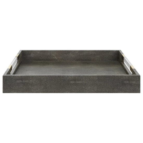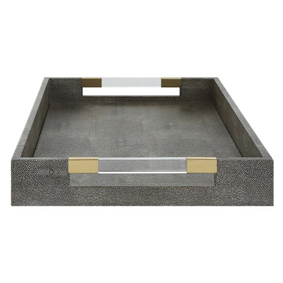 Tray is covered in an elegant grey faux shagreen with clear acrylic handles and aged gold accents.