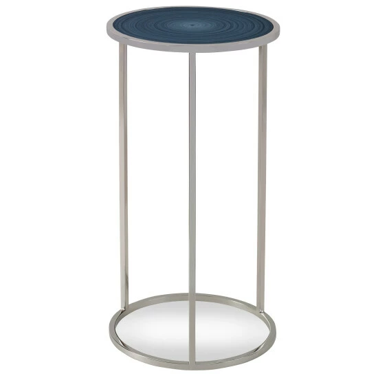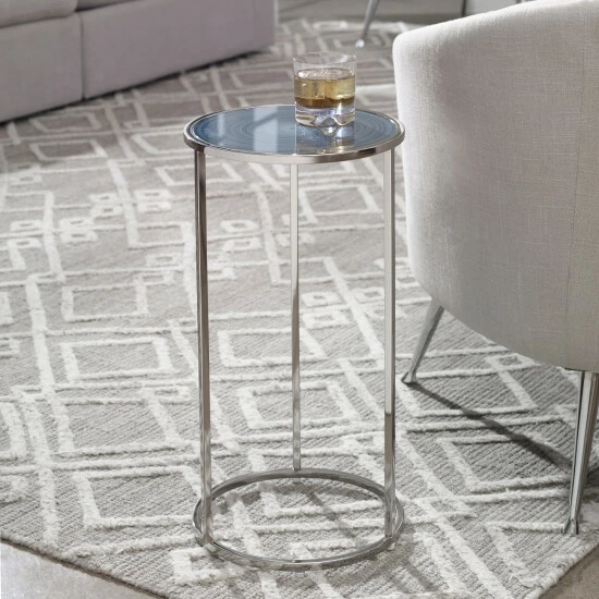 this contemporary style drink table features a round back-painted tempered glass top in a unique charcoal, light gey and white swirl design, accented by a sleek polished nickel plated stainless steel base.